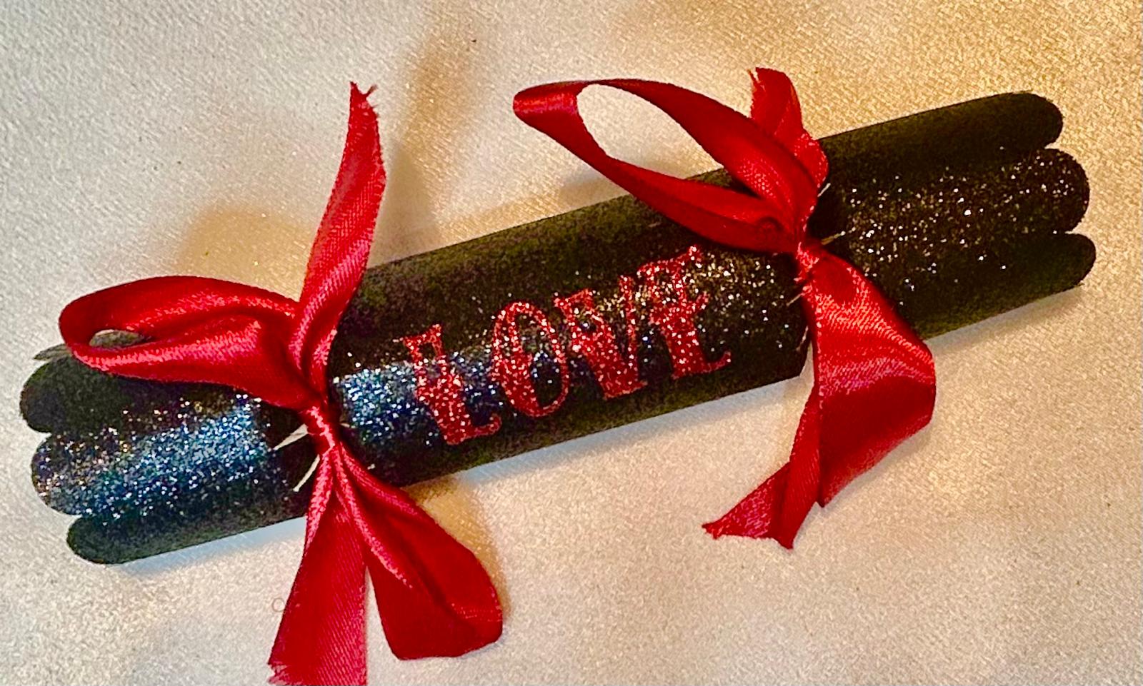 Add sparkle to any event with these gorgeous high impact large bespoke crackers. All hand made with LOTSOLOVE using fine quality black glitter card with a snapper and a heart chocolate, a heart lolly and heart balloon, love heart sweets and rose petals on the inside. You can choose the text on the cracker (up to seven characters), and your favourite ribbon and text colour.Â